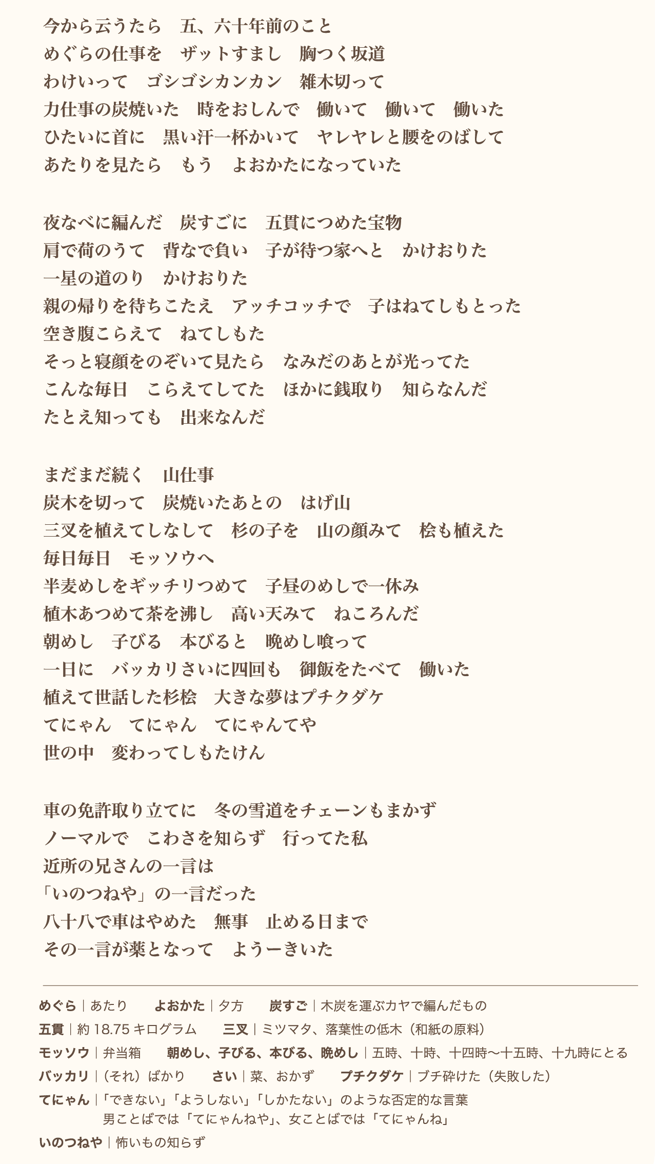 怒田では、豊永方言が使われていましたが、この言葉も失われつつあります。この唄は、上村利子さんが書いた詞をもとにして作られました。詞には、山仕事や食、そして子育てをする母としての想いが豊永方言で綴られています。当時の暮らしをありありと思い返せるほどの豊かな表現が散りばめられています。