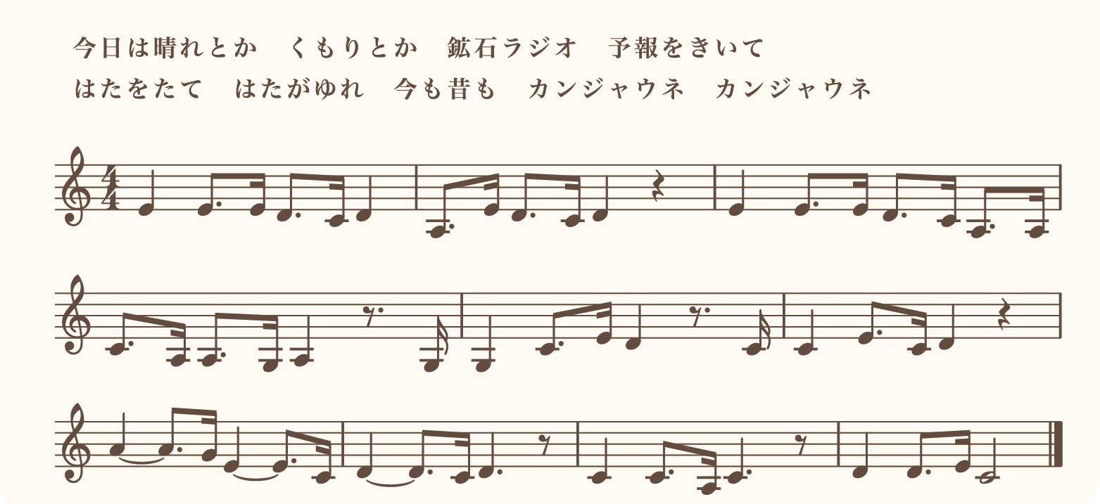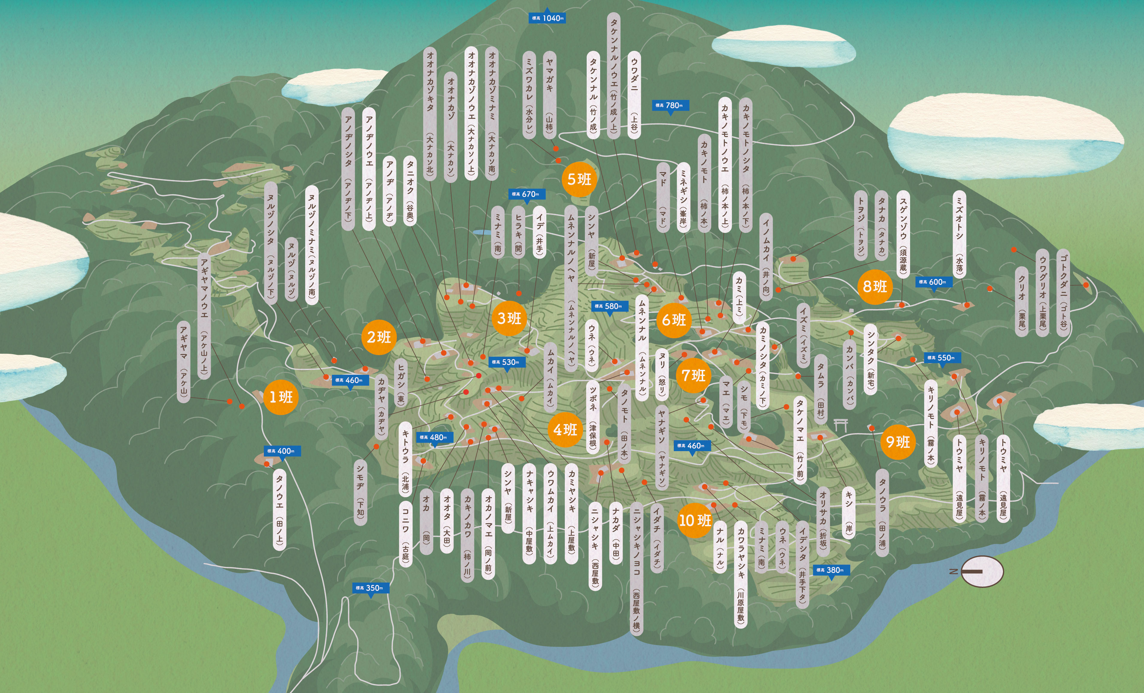 この唄は、氏原学さんへの聞き書きをもとにして作詞しました。かつて、ビニールハウスがあったところには家があり、ラジオから天気予報を聞いたおじさんがその日の天気を旗を立てて知らせていました。その家の屋号「カヂヤ(鍛冶屋)」と地形の「ウネ(畝)」が連なって「カンジャウネ」。地図には存在しない地名は、集落だからこそわかりあえる言葉のひとつです。