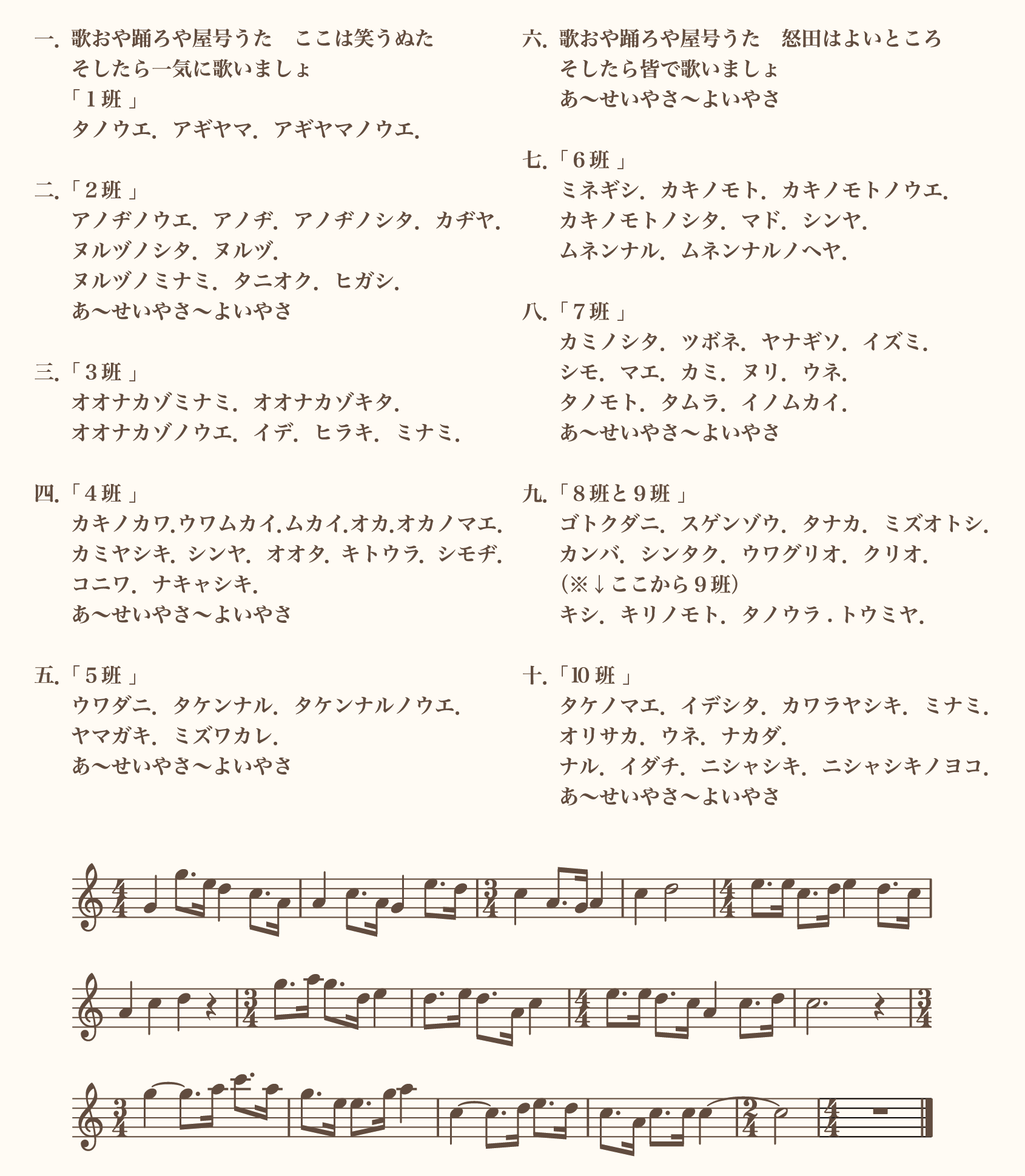 森榮太郎さん、和子さんへの聞き書き(幼少時代の話しや農作業、戦争、結婚式など)をもとにして、高知大学の学生が詞にして唄にしました。歌詞にある「とおせんぼ」とは、結婚式の際、同じ集落の住民が集落から嫁ぐために出てゆく女性を祝う一方で、道に木を置いて寂しさを表現する習わしの言葉です。現在は見ることがない風習が言葉のなかに含まれています。